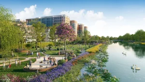 Hơn 200ha diện tích cảnh quan, 100ha mảng xanh mặt nước, 05 công viên đa trải nghiệm và 1,5km đường đi bộ lễ hội quanh năm.